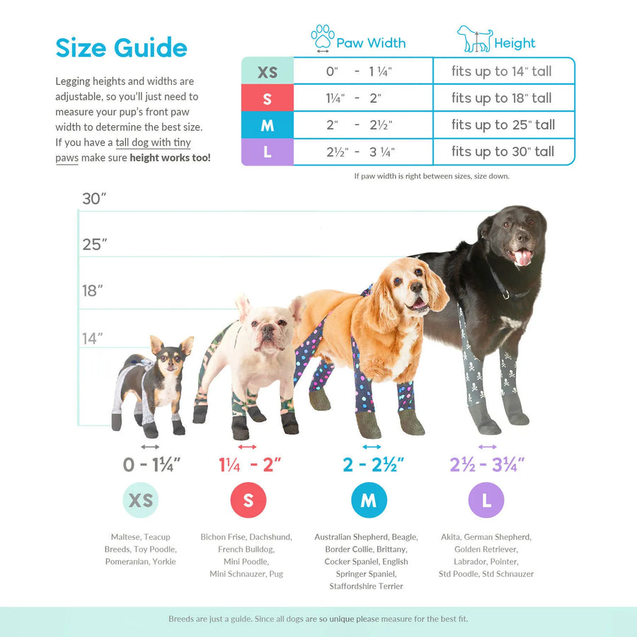 Just slip paws into the leggings and adjust them over the back for the paw-fect fit. Attach the NEW elastic collar connector to your pup's collar or leash, and you are all set for a stay-on fit.