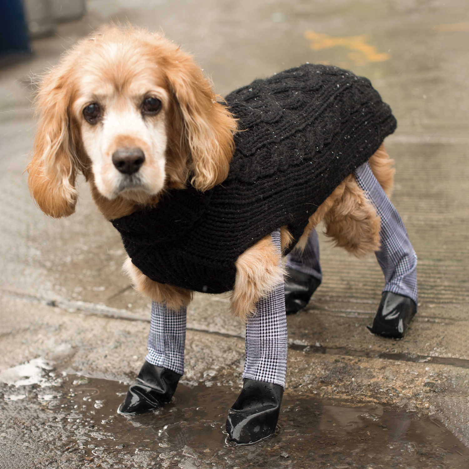 Our Easy-On design is super simple to get on and off—there are no elastic drawstring leg openings, and they feature an elastic collar connector to attach to your dog’s harness or collar.