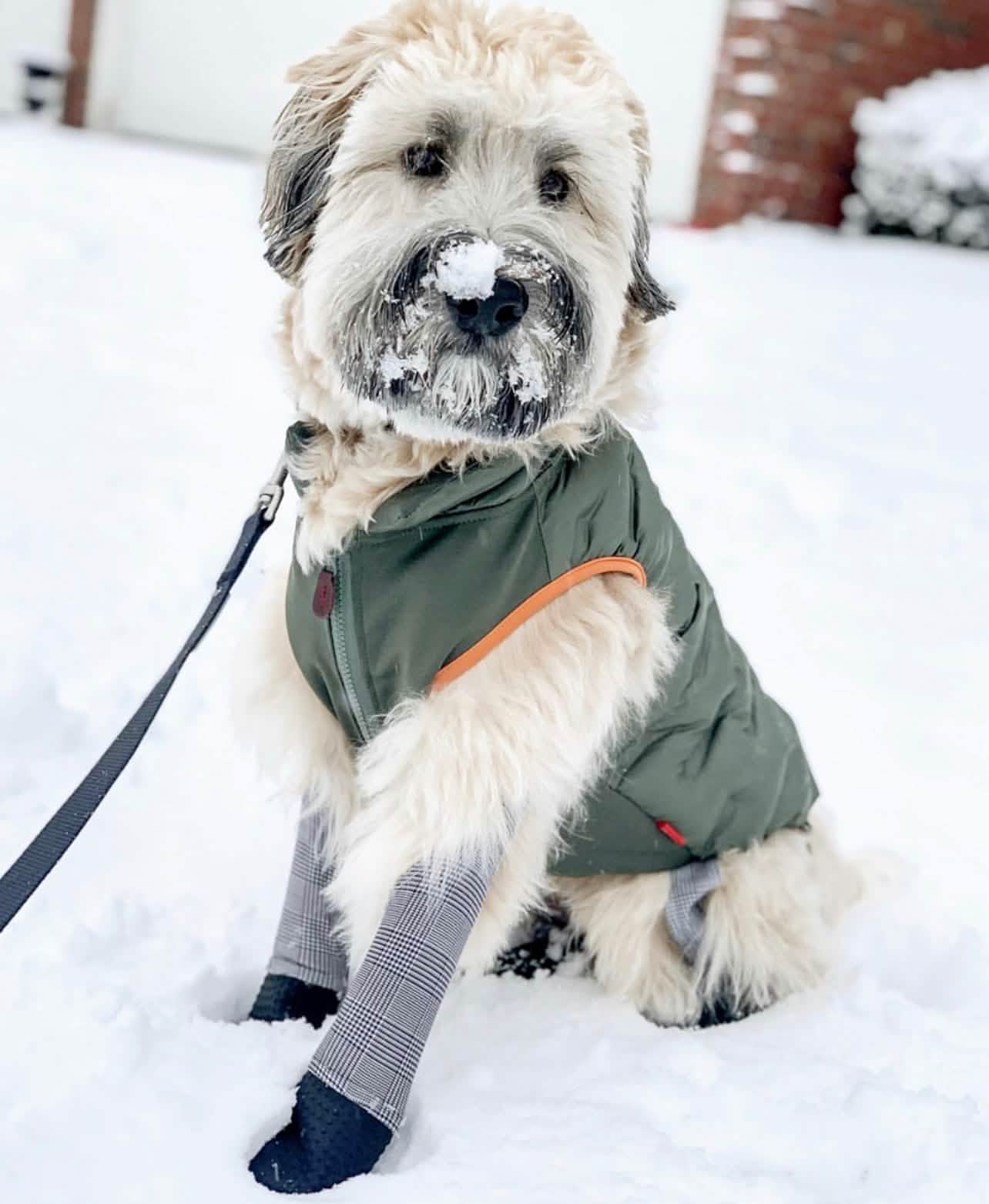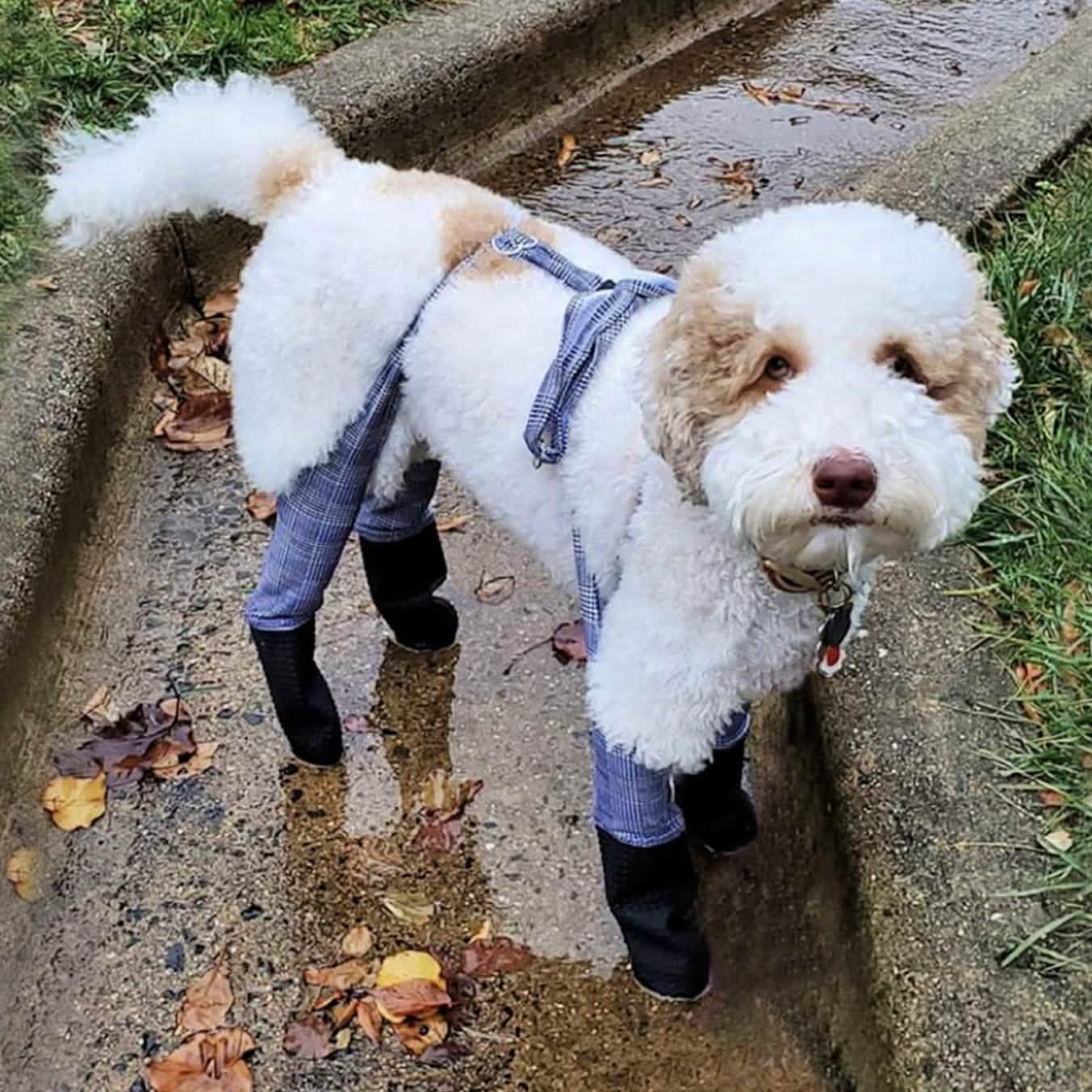 Walkee Paws are the world’s first all-in-one dog leggings designed to be the “better bootie.” They’re easy on and stay on thanks to our patented over-the-back design. Each pair features four-way stretch fabric for the ultimate canine comfort, plus waterproof rubber soles to protect your pooch from all the ruff stuff outside. Walkee Paws leggings keep your dog safe from dangerous snowmelt chemicals, rain, mud, burrs, and hot pavement (withstands heat up to 302°F and cold down to -40°F).