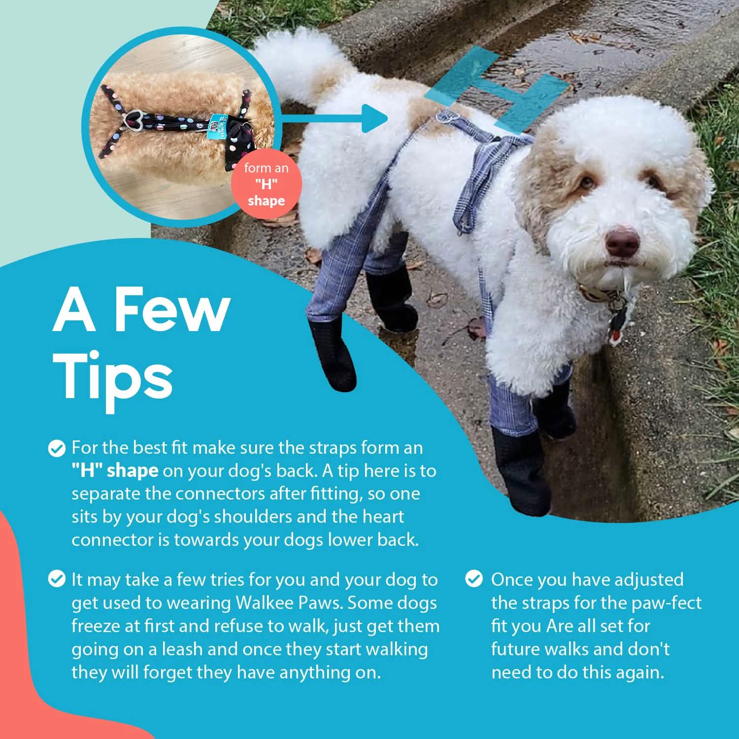 Just slip paws into the leggings and adjust them over the back for the paw-fect fit. Attach the NEW elastic collar connector to your pup's collar or leash, and you are all set for a stay-on fit.