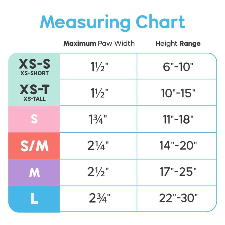 ‣ XS- Short and XS- Tall feature the same boots. XS-Tall is for taller dogs with tiny paws - it has longer leggings and longer straps.