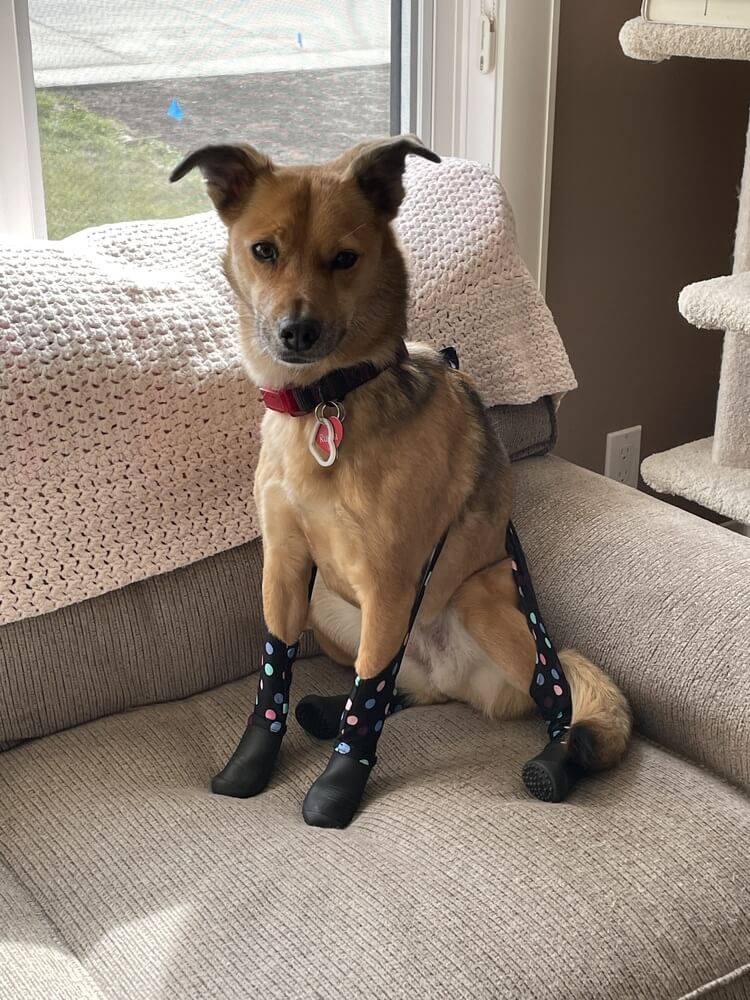 Our Indoor Leggings feature grippy socks with a soft comfortable fit and are a perfect solution for pets that need some help maneuvering around. It's easy for dogs’ feet to slip and slide on wood floors, especially for our senior pets.