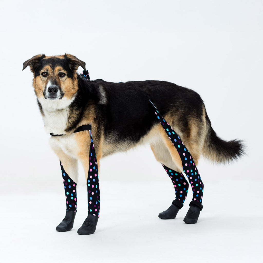 Once you get used to them they are super easy to use. It will take a bit longer the first time as you will need to adjust the fabric through the stoppers for a customized leg and back fit on your pup. The legging sleeve acts like a sling, allowing you to easily slip each paw in.
