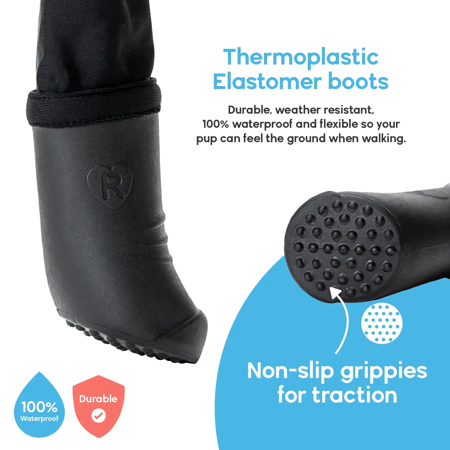 Absolutely! Our thermoplastic boots are molded in one piece without seams, making them 100% waterproof and able to withstand temperatures as low as -40° F. The 4-way stretch leggings are water-resistant too, keeping your pup’s legs dry and preventing painful snowballs.