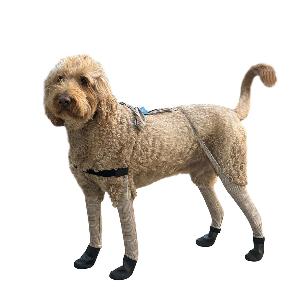 Our new Velcro Chest Strap ensures a secure fit, especially for dogs with short hair or rounded backs, by keeping the leggings in place. It comes included with our New Beige Plaid and Black (Size L) products, which are priced $5 higher. If you’re purchasing a different color, you can add the Velcro Chest Strap separately for $3.99 during checkout.
